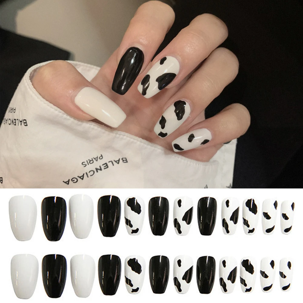 Unghie finte con stampa mucca bara bianca nera macchie nere unghie finte Gel UV Design unghie finte estive francesi|False Nails| - AliExpress