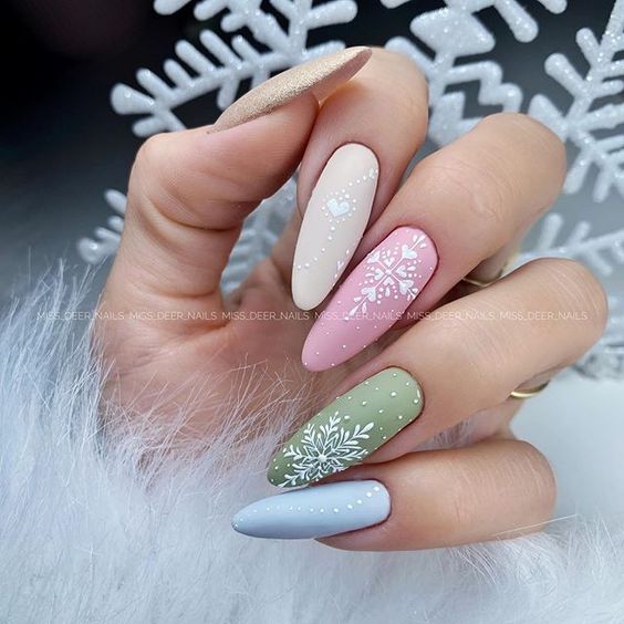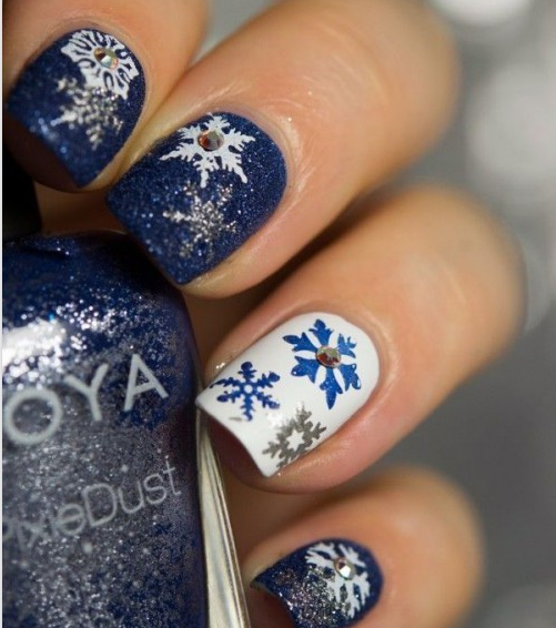 Маникюр за Нова година. Един ефектен вариант като маникюр за къси нокти е този маникюр в синьо. Бебешко синьото изглежда много красиво върху ноктите, а подобни декорации на маникюр със снежинки са подходящи както за новогодишен маникюр, така и за носене през цялата зима. В повечето случаи нежният маникюр за къси нокти на Нова година се извършва в пастелни или голи нюанси и е декориран с минимален брой декоративни елементи, сред които са особено разпространени кристали, бульони, триене и полупрозрачни искри.