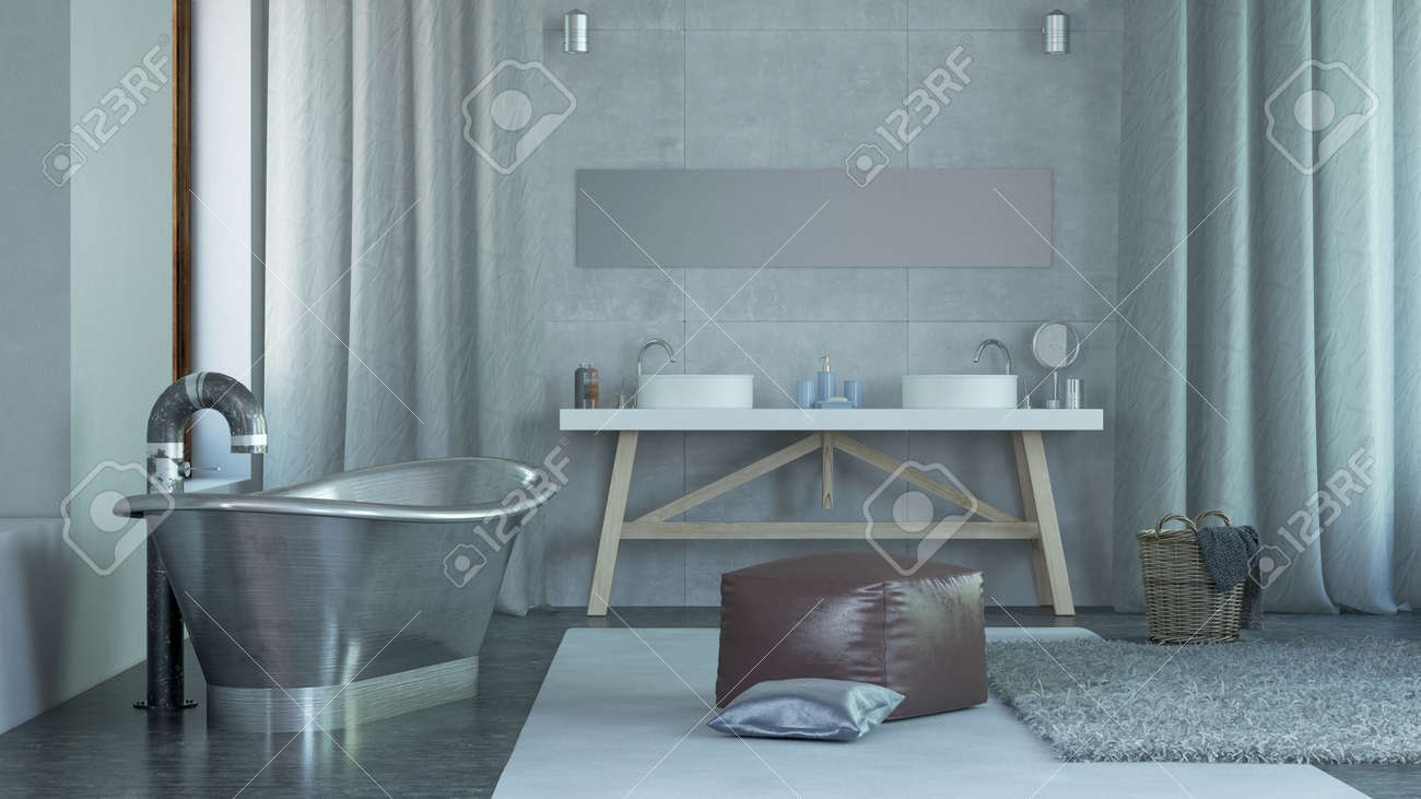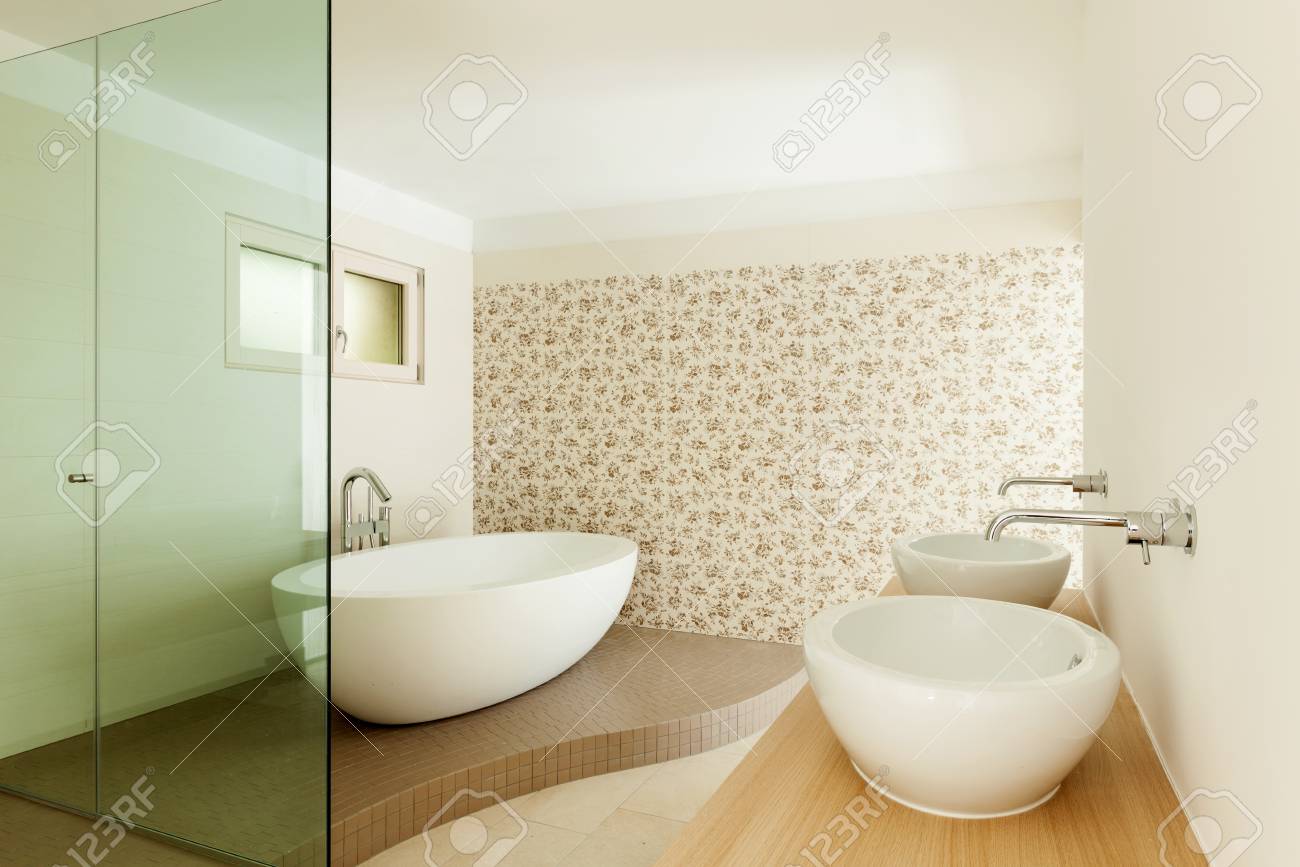 Modern Architectural Amplio Inicio Baño Diseño De Interiores Con Acero De Bañera. Fotos, Retratos, Imágenes Y Fotografía De Archivo Libres De Derecho. Image 38437452.