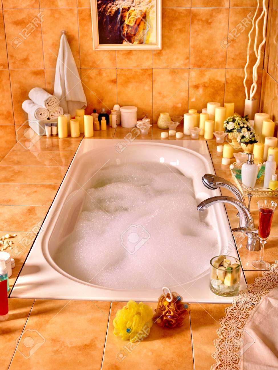 Inicio Baño Interior Con Baño De Burbujas. Quemar Velas. Fotos, Retratos, Imágenes Y Fotografía De Archivo Libres De Derecho. Image 39838141.