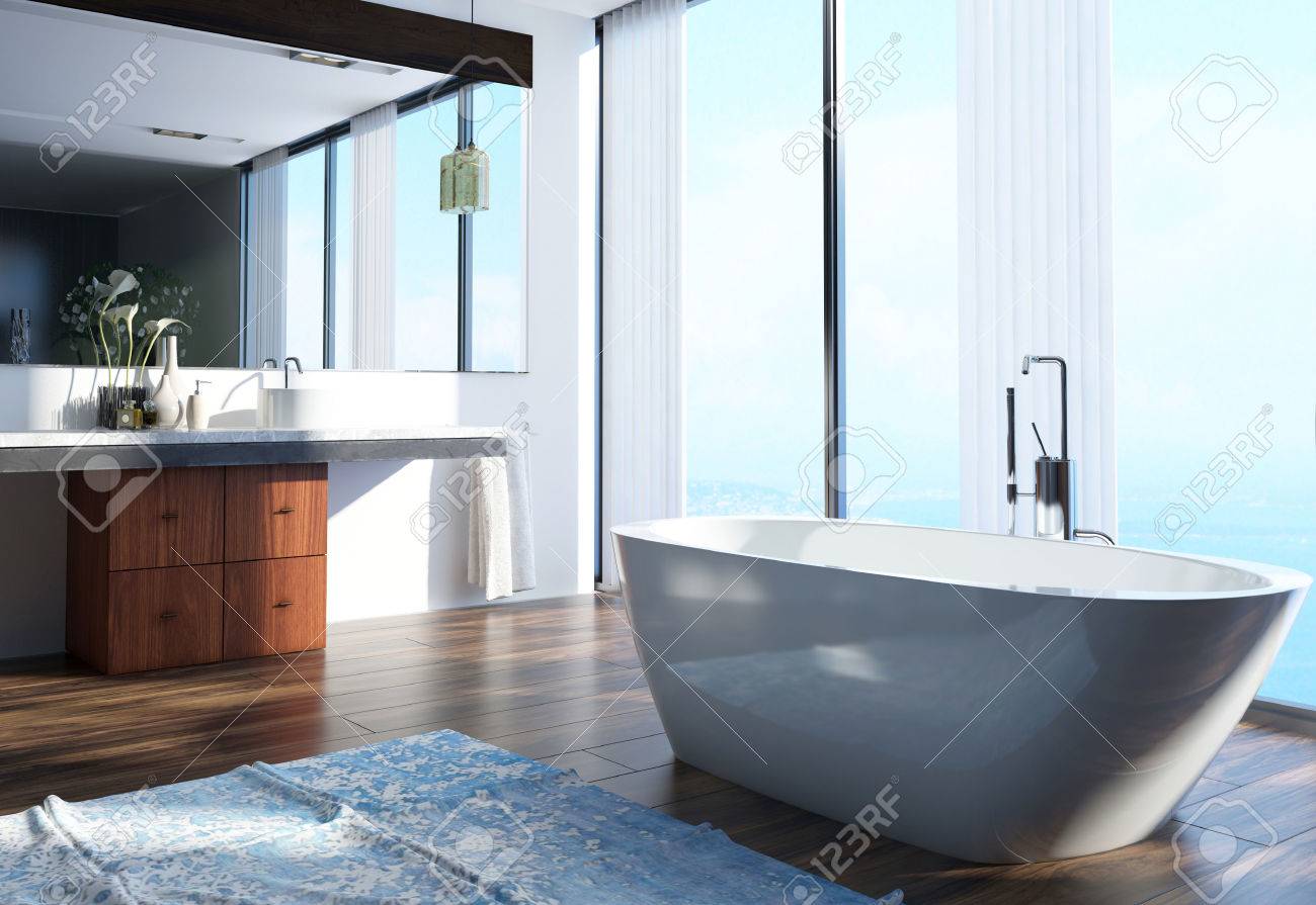Amplio Moderno Arquitectónico Inicio Baño Diseño De Interiores Con área De Lavado En El Lado, Bañera En El Centro Y Gran Vidrio De Windows. Fotos, Retratos, Imágenes Y Fotografía De Archivo Libres
