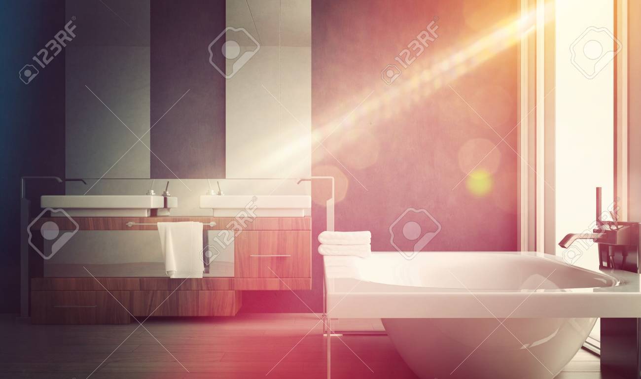 Diseño Arquitectónico Interior De Inicio Cuarto De Baño Moderno Iluminado Por La Luz Del Sol A Través Del Vidrio De Windows. Fotos, Retratos, Imágenes Y Fotografía De Archivo Libres De Derecho. Image