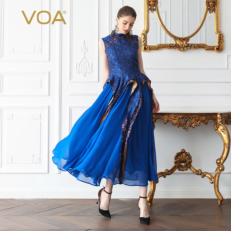 VOA Zijde Georgette Runway Party Jurk Vrouwen Geplooide Maxi Lange Jurken Slanke Tuniek Print Blauwe Vintage Elegante Mouwloze A570|Dresses| - AliExpress