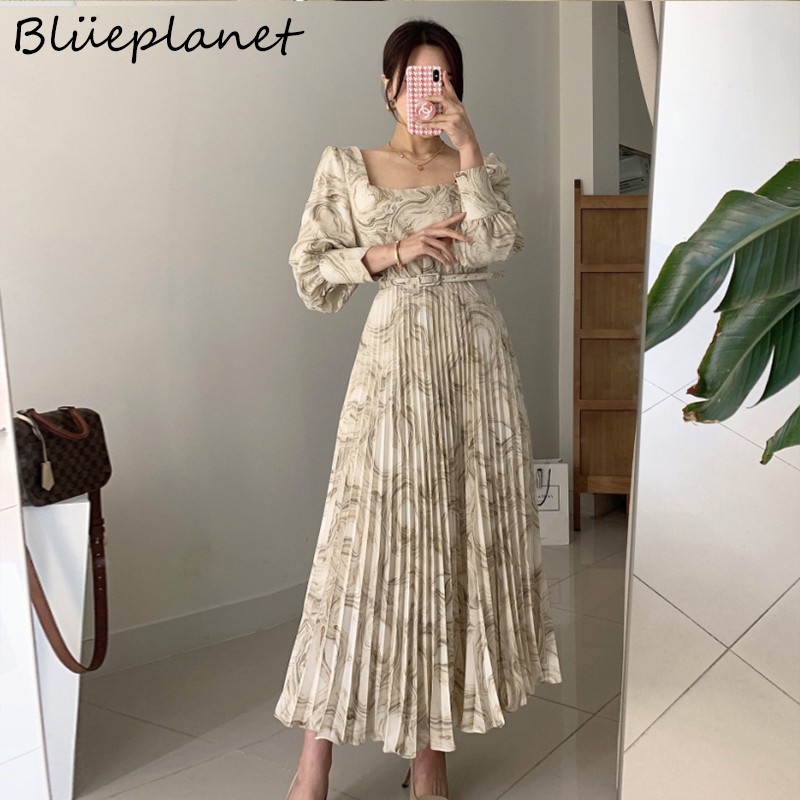 Korean Style Women chic Square Neck Long Sleeve Long Maxi Floral Print Pleated Dress QYtf | Shopee Thailand