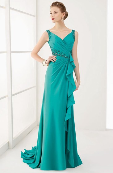 4.67 reviews (3) Satin V Neck Cap Sleeve Sheath Knee Length Lace Prom Dress Shown In Turquoise. 5 reviews (2) A-Line Jeweled Top Sleeveless Chiffon Pleated Dress. 3-4-sleeve Pencil short Lace Mother of the Bride Dress With Low-V Back. Jewel-Neck Sleeveless Tulle A-line Dress With Lace top.