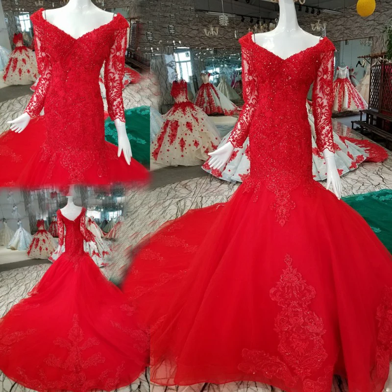Vestido de noche de manga larga y apliques de encaje para mujer, vestidos de fiesta formales elegantes de cola larga y cola de sirena, rojo, fotos reales, 2021|Vestidos de noche| - AliExpress
